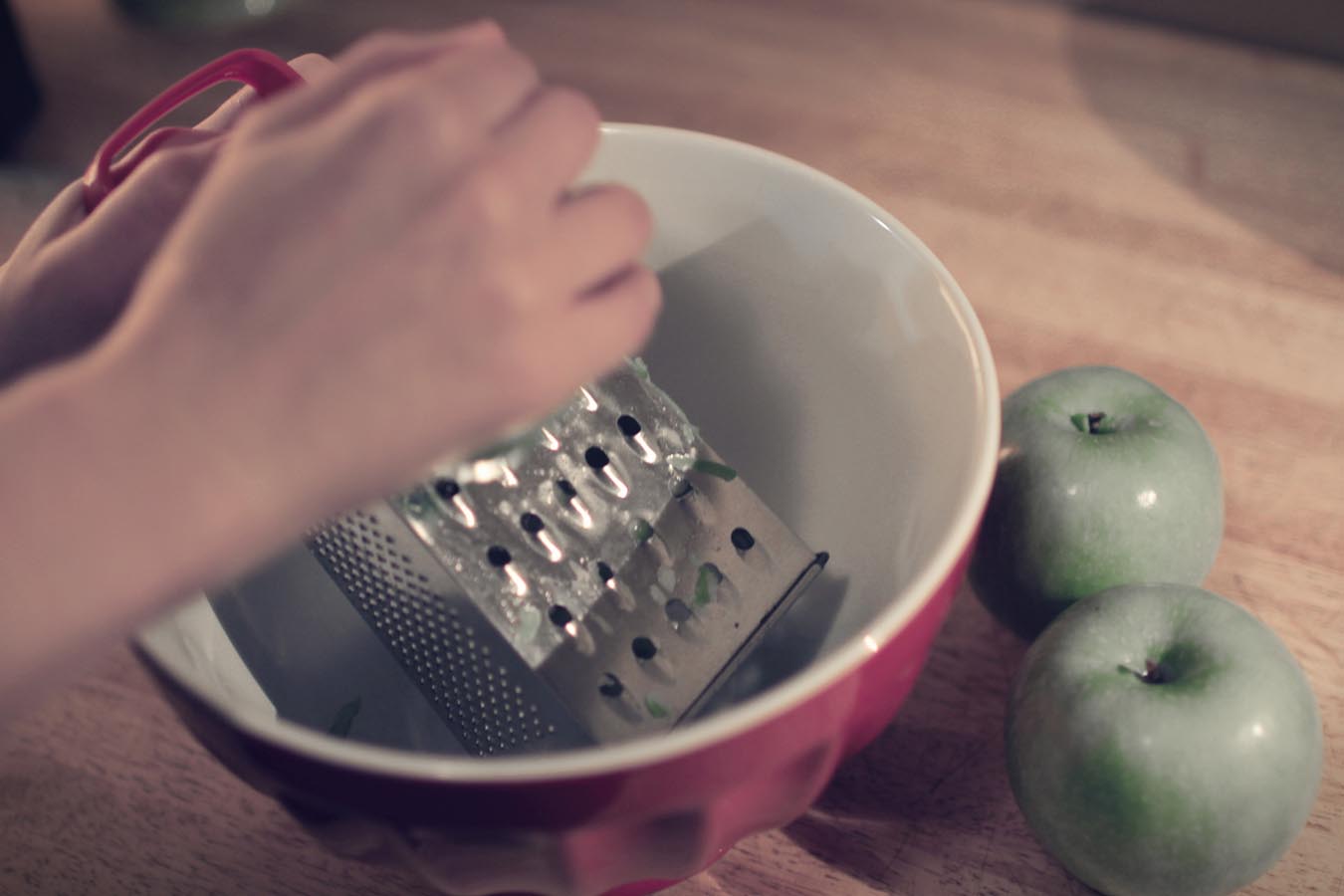 Wash and grate the apple on a box grater on the larger pore size. Measure out 1 cup, drain out the liquid by squeezing it out with your hands and set aside.
