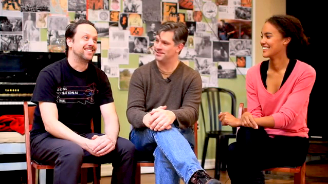 Young actor Kaneza Schaal interviews performer Mike Iveson and director John Collins, of Elevator Repair Service, at New York Theater Workshop.