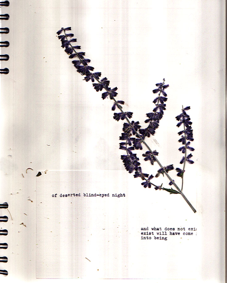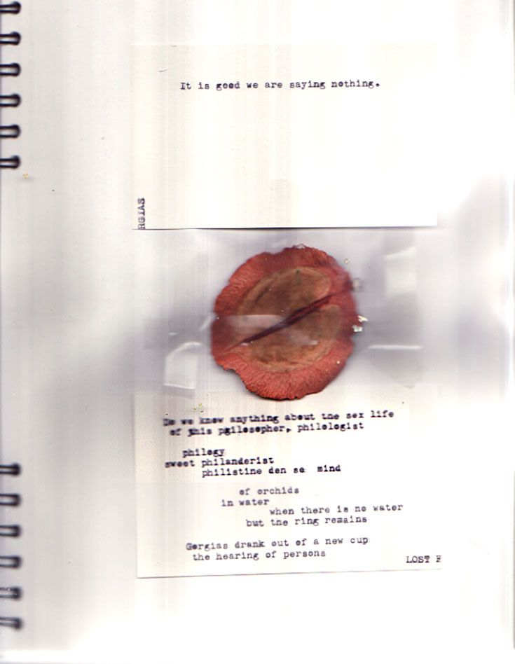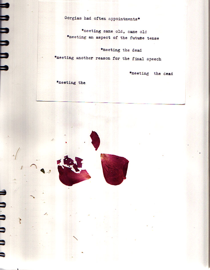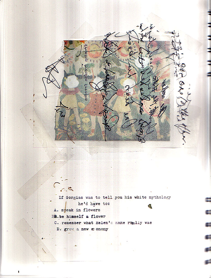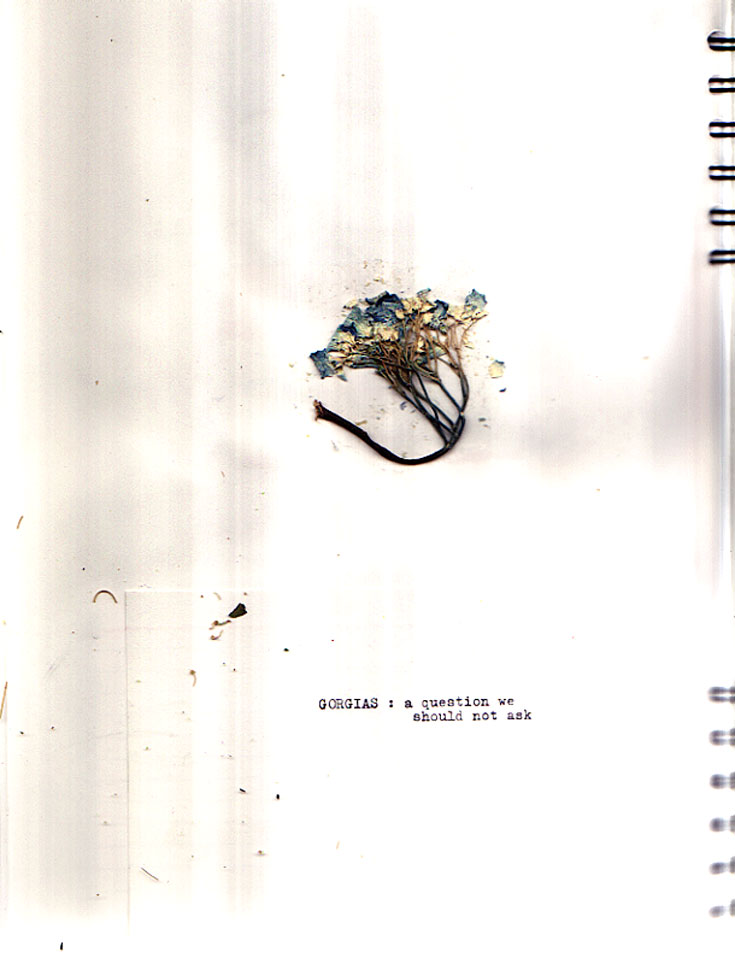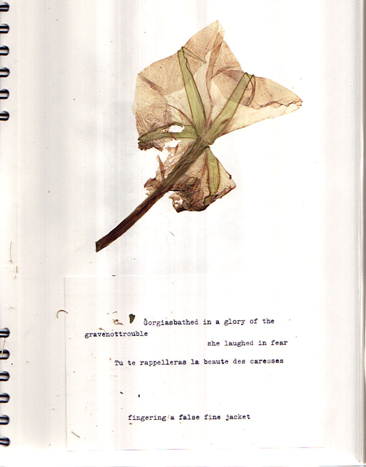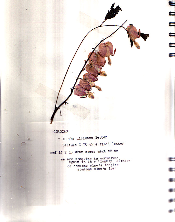 In part 3, "The Economy of Helen," the fragments of flowers and text twine together. The piece includes textual bits of phrases and lines from PreSocratic philosophers as well as a visual homage to Emily Dickinson's herbarium. It also marks the entrance of Gorgias as a character—both historically and symbolically—into the working of the entire 'poellage' (part poem, part collage). Materials in this section have been taken from the streets of New York City, the gardens of Amherst, as well as from elsewhere (c.f. balloon-parts from a recent book party). Maurice Blanchot wrote: "The fragmentary: writing belongs to the fragmentary when all has been said." Against this—or rather amidst this situation of remnants—the beauty of construction waits to be spoken.