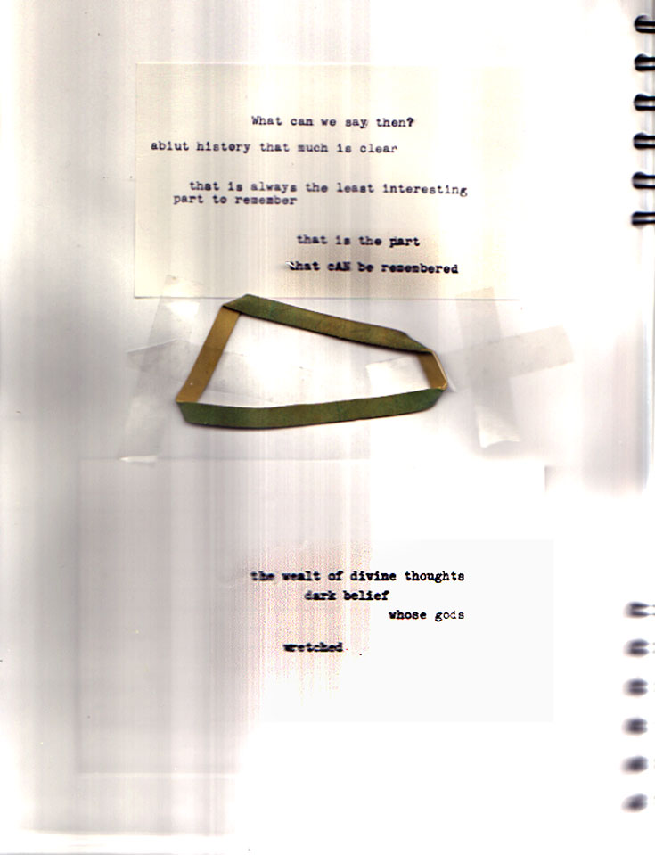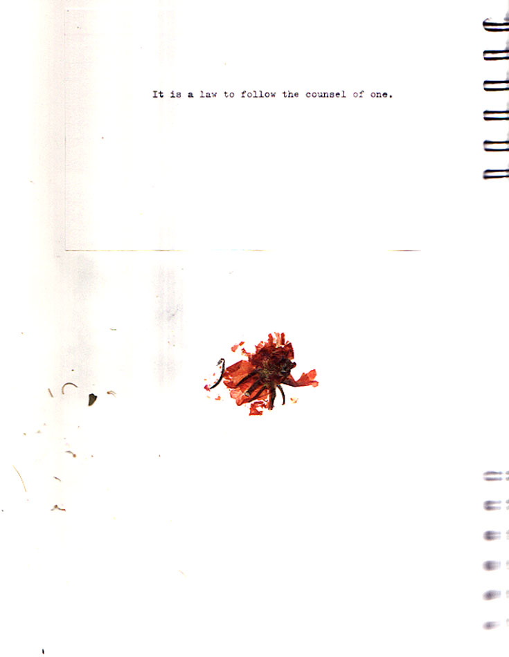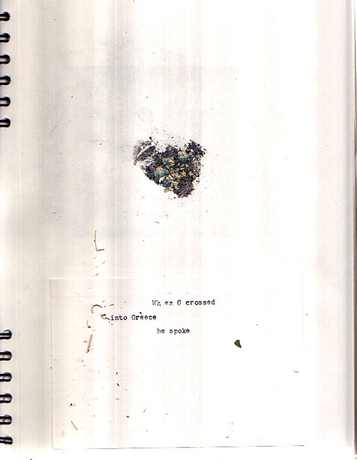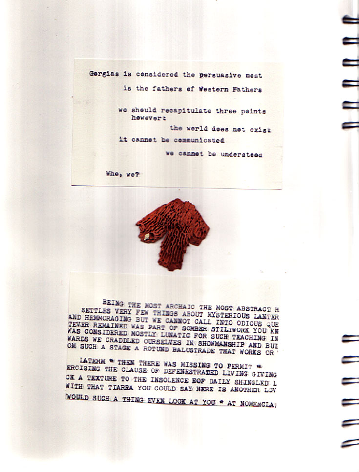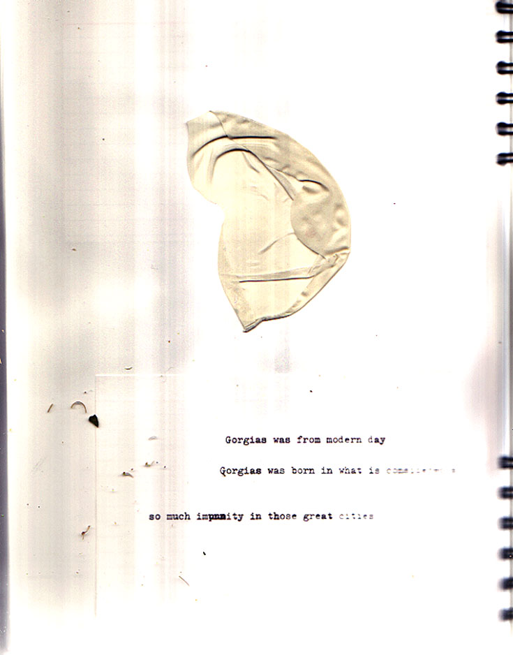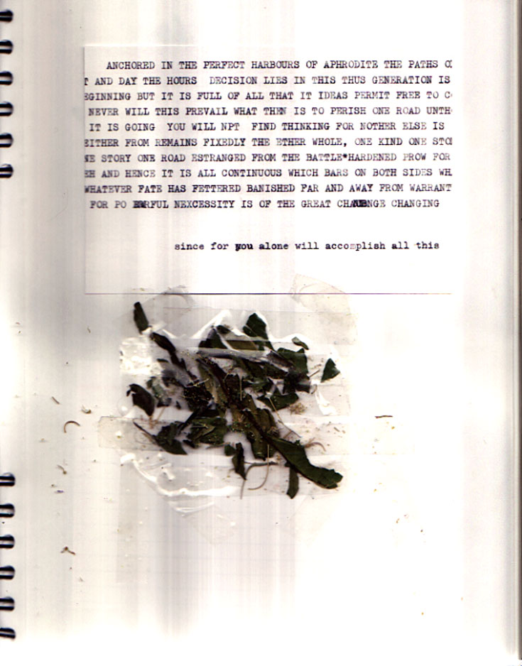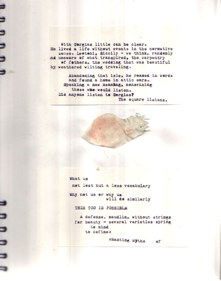 In part 3, "The Economy of Helen," the fragments of flowers and text twine together. The piece includes textual bits of phrases and lines from PreSocratic philosophers as well as a visual homage to Emily Dickinson's herbarium. It also marks the entrance of Gorgias as a character—both historically and symbolically—into the working of the entire 'poellage' (part poem, part collage). Materials in this section have been taken from the streets of New York City, the gardens of Amherst, as well as from elsewhere (c.f. balloon-parts from a recent book party). Maurice Blanchot wrote: "The fragmentary: writing belongs to the fragmentary when all has been said." Against this—or rather amidst this situation of remnants—the beauty of construction waits to be spoken.