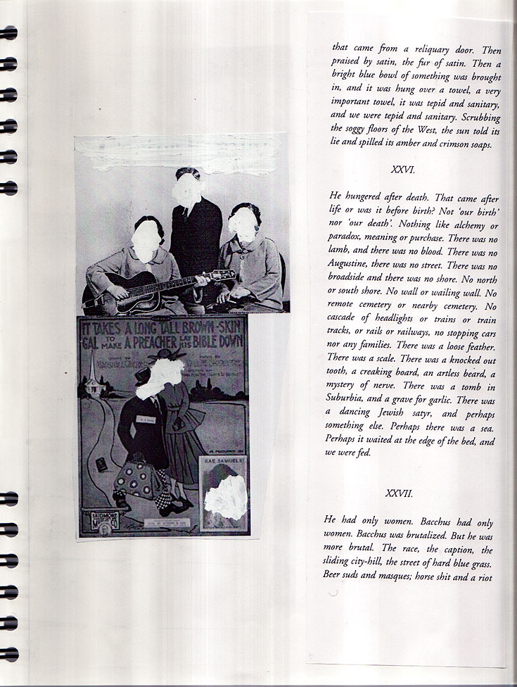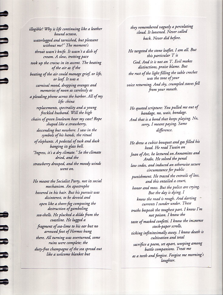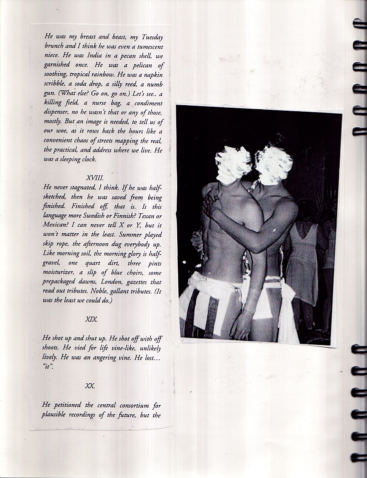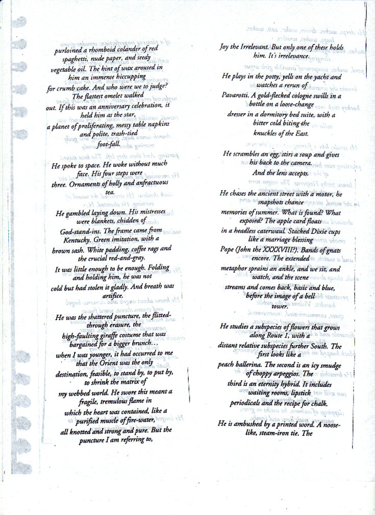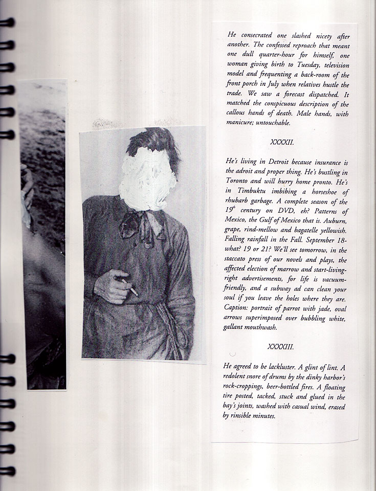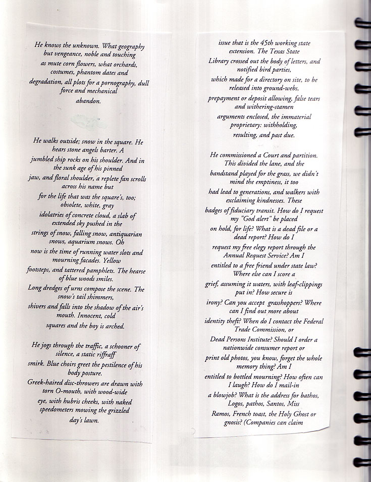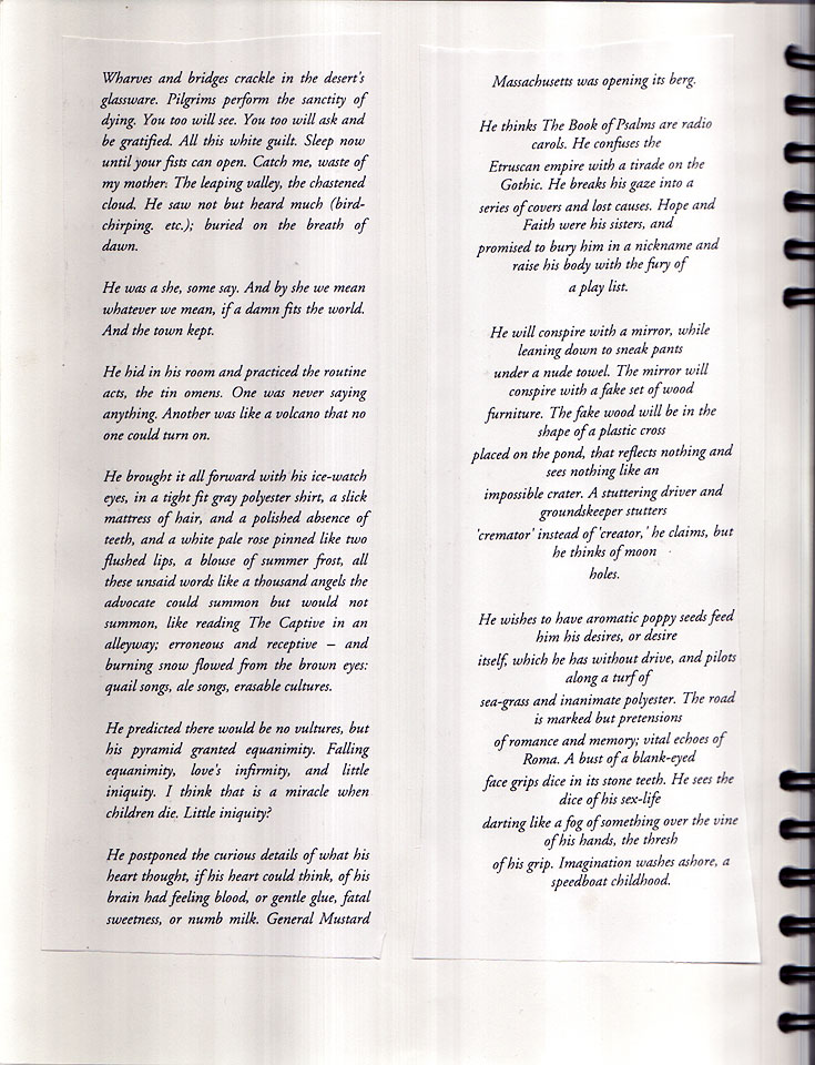 "The Gorgias" is a book in six parts, which includes fragments of poetry, collage, and documents. In part 1, "The Life of Gorgias," the book opens with an image of the Paris Arcades, an allusion to both 19th century French popular culture and the strong influence it has had on poets and writers since. (See Walter Benjamin's discussion on the flaneur and Baudelaire, among other topics, in "The Arcades Project," one of the main inspirations behind "The Gorgias.") And so in part 1, from the author's life comes a mixture of curiosities and collections: snippets of Google chats and emails, bodega and Amazon.com receipts, YouTube links and abandoned poems, texts from poems and typewritten essays that mention, by turns, Samuel Johnson, Proust, or John Ashbery. In this stage, the possibility for literature is only latent, and shares an uncomfortable space with the banal (and interesting) minutiae of daily life. In part 2, "On What is Not" (an allusion to Gorgias's lost existential track on the impossibility of knowing anything), a long fragmentary prose poem emerges—it begins to sandwich together and unify lived experience toward a decidedly literary space. Along the way, eruptions of the contemporary, from images to postage stamps and immolated pornography remain. What are the differences and borders between life and art? "The Gorgias," as a whole—and increasingly in these parts—moves away from answering these questions with a theory or concept in favor of a performance: poetic and visual. A rhetorical demonstration where leaving out and putting in (a text, a life) are equally frustrated.