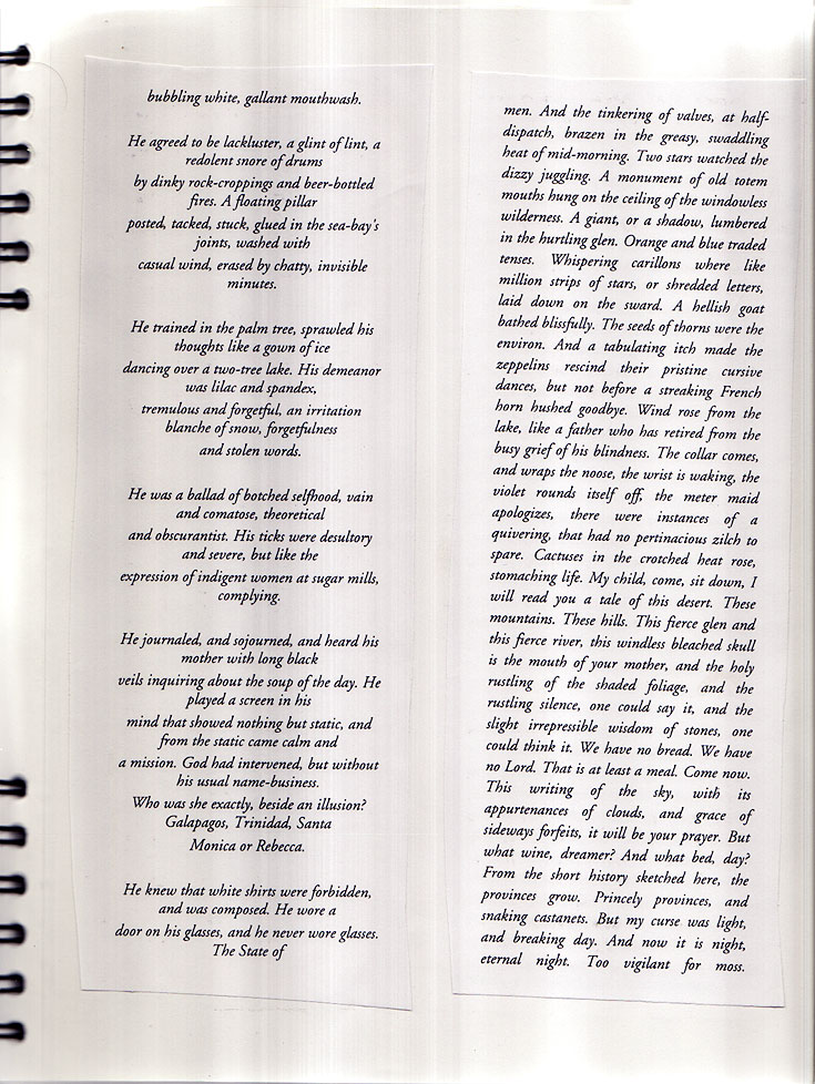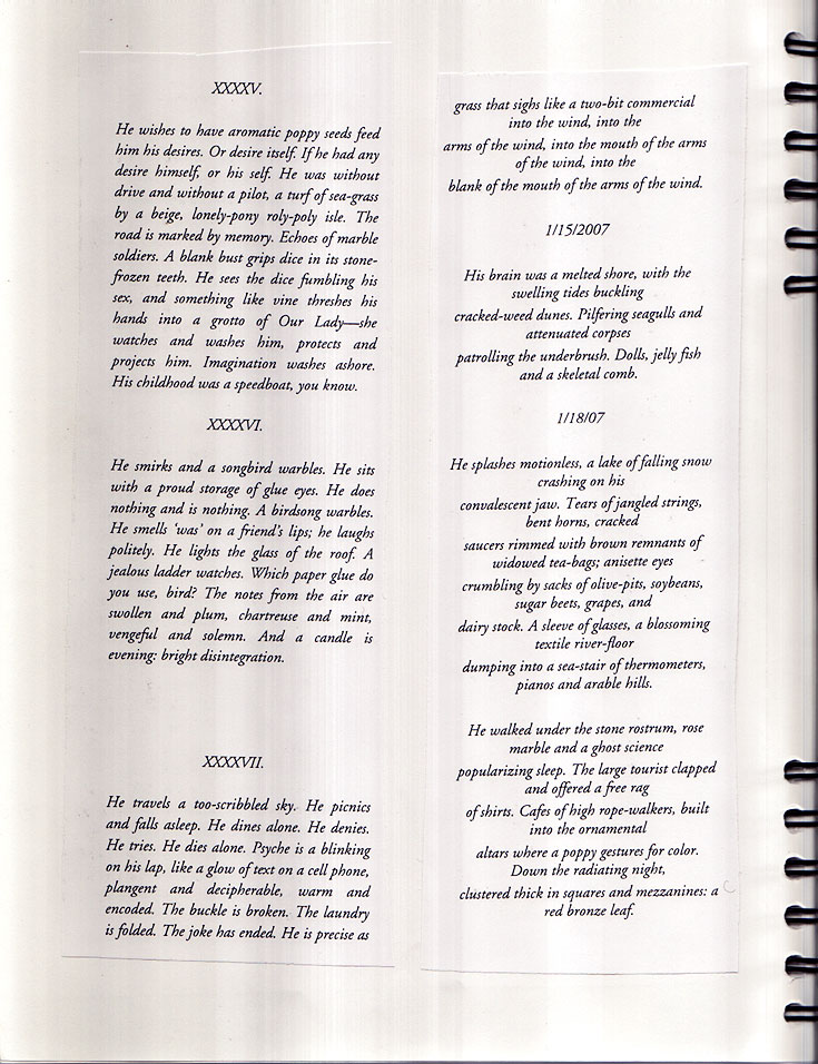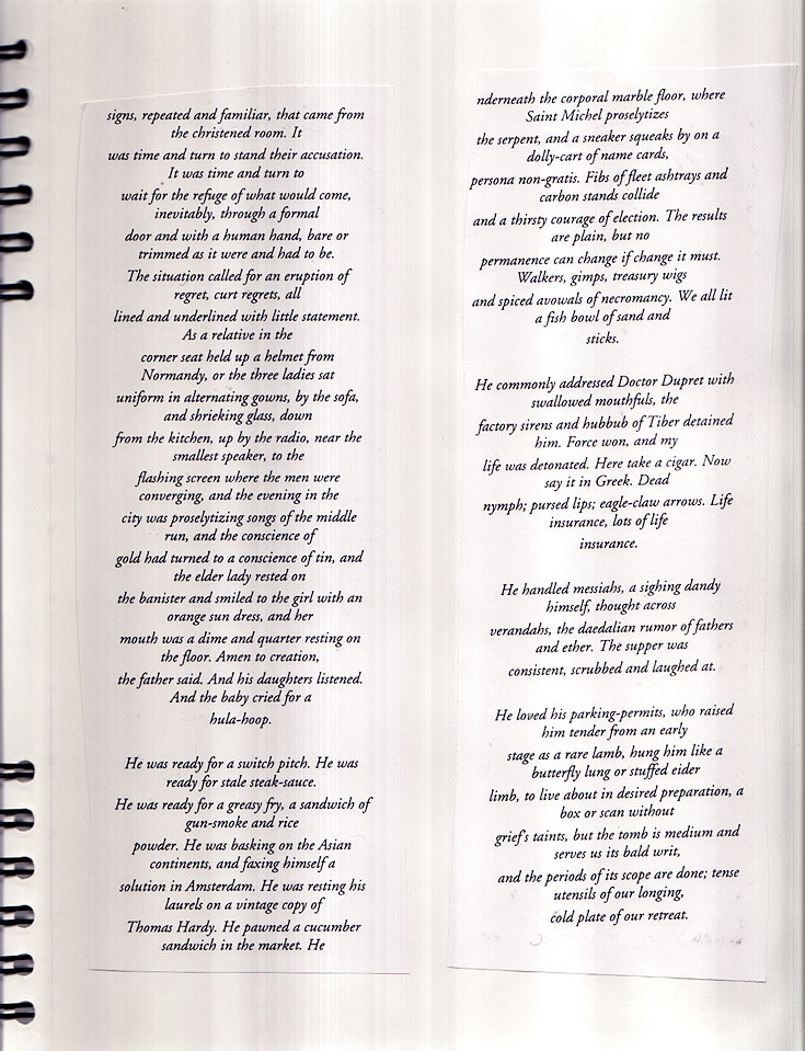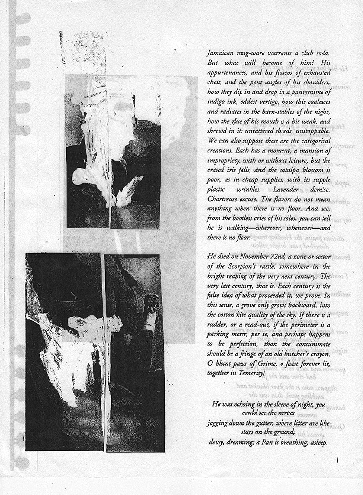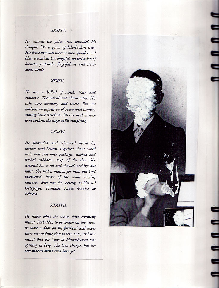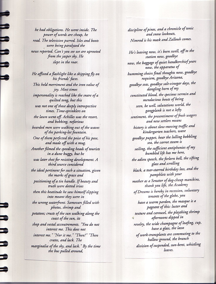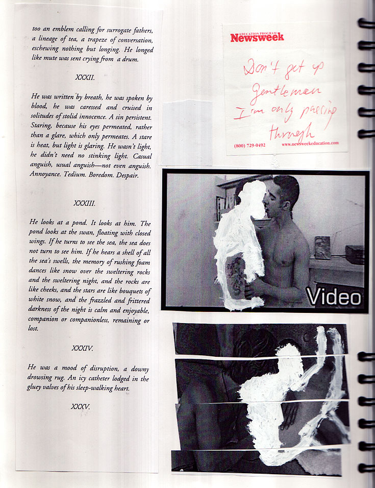 "The Gorgias" is a book in six parts, which includes fragments of poetry, collage, and documents. In part 1, "The Life of Gorgias," the book opens with an image of the Paris Arcades, an allusion to both 19th century French popular culture and the strong influence it has had on poets and writers since. (See Walter Benjamin's discussion on the flaneur and Baudelaire, among other topics, in "The Arcades Project," one of the main inspirations behind "The Gorgias.") And so in part 1, from the author's life comes a mixture of curiosities and collections: snippets of Google chats and emails, bodega and Amazon.com receipts, YouTube links and abandoned poems, texts from poems and typewritten essays that mention, by turns, Samuel Johnson, Proust, or John Ashbery. In this stage, the possibility for literature is only latent, and shares an uncomfortable space with the banal (and interesting) minutiae of daily life. In part 2, "On What is Not" (an allusion to Gorgias's lost existential track on the impossibility of knowing anything), a long fragmentary prose poem emerges—it begins to sandwich together and unify lived experience toward a decidedly literary space. Along the way, eruptions of the contemporary, from images to postage stamps and immolated pornography remain. What are the differences and borders between life and art? "The Gorgias," as a whole—and increasingly in these parts—moves away from answering these questions with a theory or concept in favor of a performance: poetic and visual. A rhetorical demonstration where leaving out and putting in (a text, a life) are equally frustrated.
