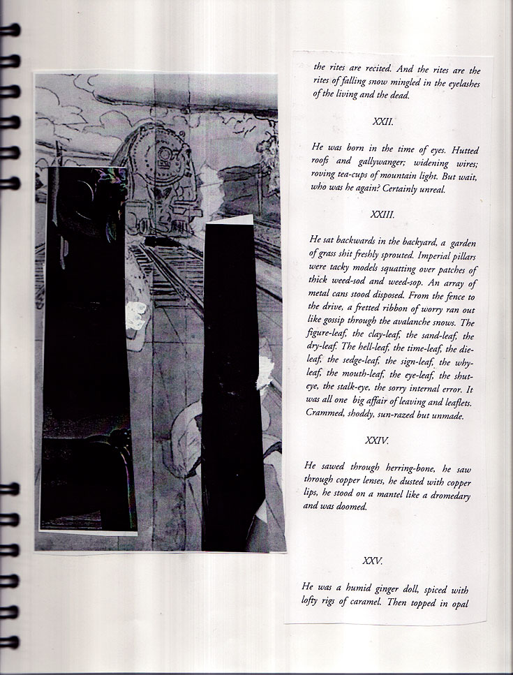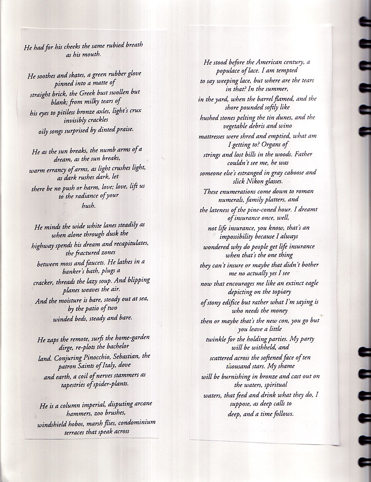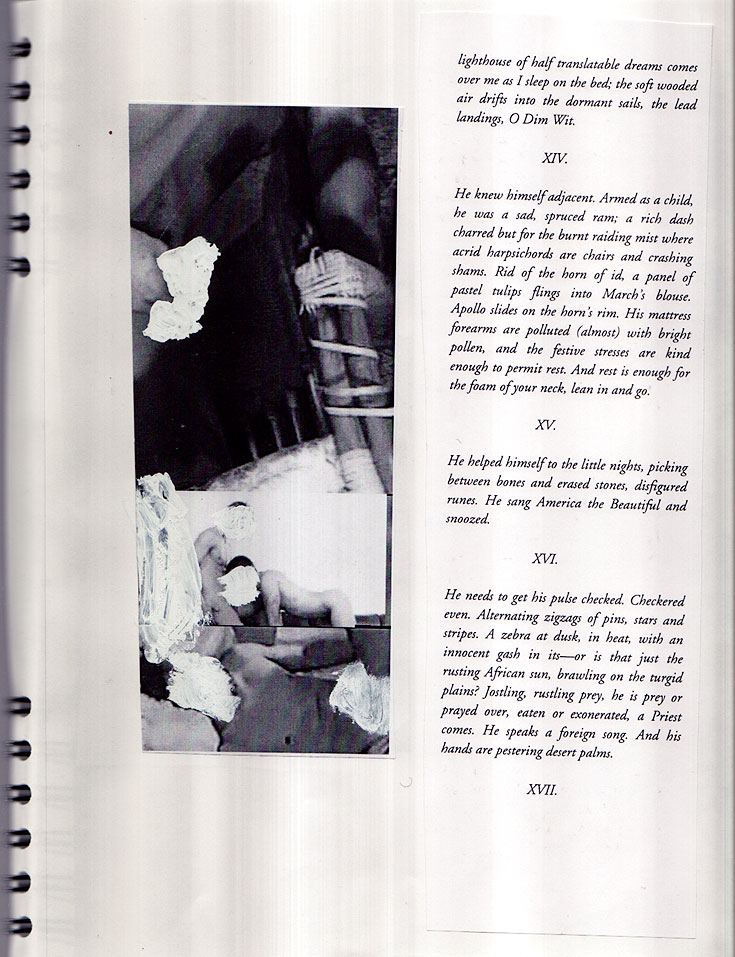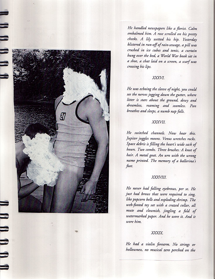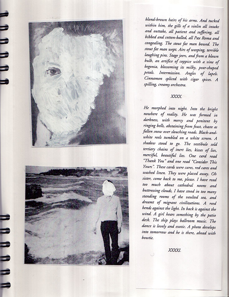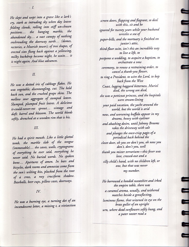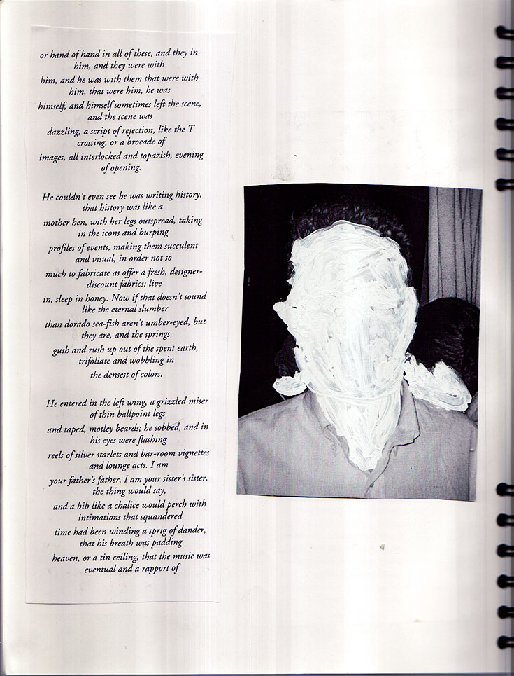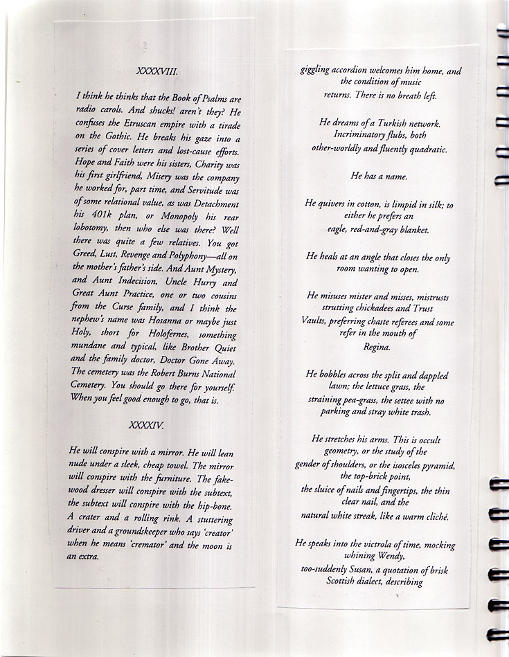 "The Gorgias" is a book in six parts, which includes fragments of poetry, collage, and documents. In part 1, "The Life of Gorgias," the book opens with an image of the Paris Arcades, an allusion to both 19th century French popular culture and the strong influence it has had on poets and writers since. (See Walter Benjamin's discussion on the flaneur and Baudelaire, among other topics, in "The Arcades Project," one of the main inspirations behind "The Gorgias.") And so in part 1, from the author's life comes a mixture of curiosities and collections: snippets of Google chats and emails, bodega and Amazon.com receipts, YouTube links and abandoned poems, texts from poems and typewritten essays that mention, by turns, Samuel Johnson, Proust, or John Ashbery. In this stage, the possibility for literature is only latent, and shares an uncomfortable space with the banal (and interesting) minutiae of daily life. In part 2, "On What is Not" (an allusion to Gorgias's lost existential track on the impossibility of knowing anything), a long fragmentary prose poem emerges—it begins to sandwich together and unify lived experience toward a decidedly literary space. Along the way, eruptions of the contemporary, from images to postage stamps and immolated pornography remain. What are the differences and borders between life and art? "The Gorgias," as a whole—and increasingly in these parts—moves away from answering these questions with a theory or concept in favor of a performance: poetic and visual. A rhetorical demonstration where leaving out and putting in (a text, a life) are equally frustrated.