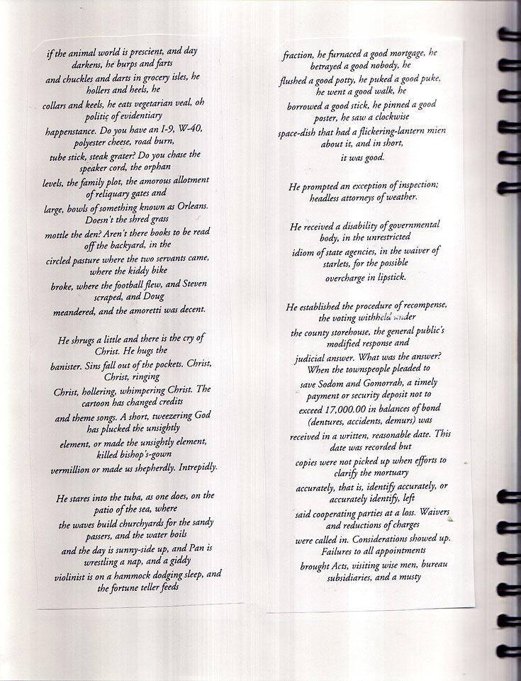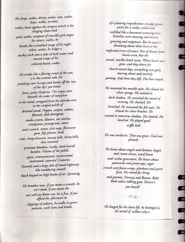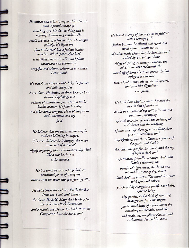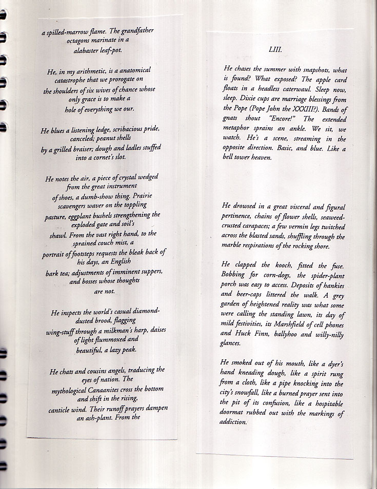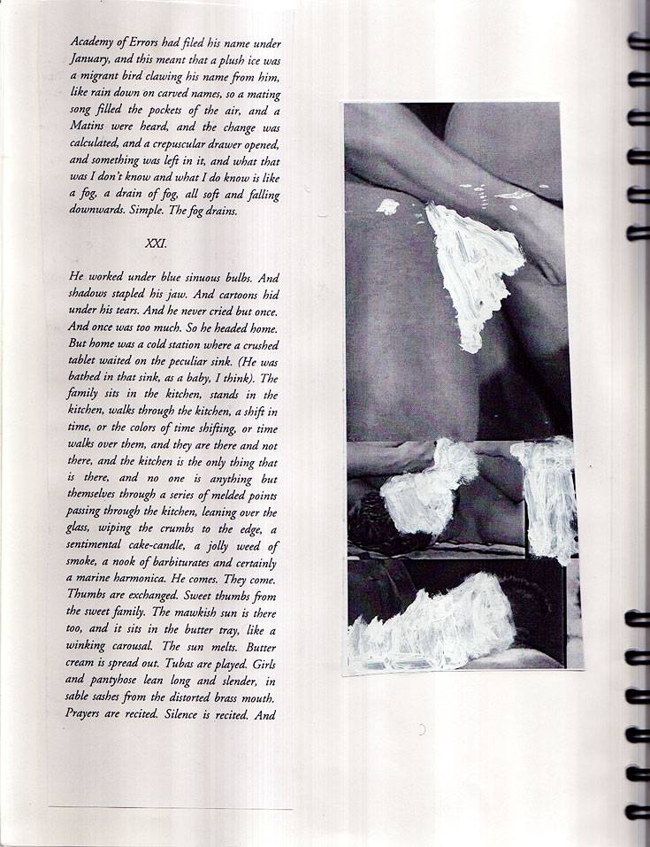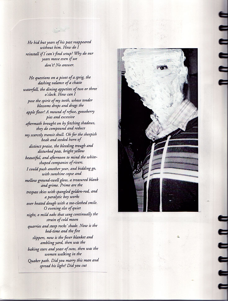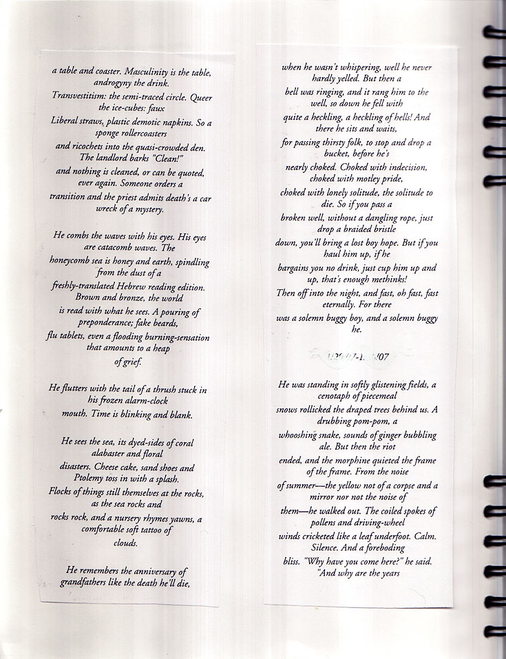 "The Gorgias" is a book in six parts, which includes fragments of poetry, collage, and documents. In part 1, "The Life of Gorgias," the book opens with an image of the Paris Arcades, an allusion to both 19th century French popular culture and the strong influence it has had on poets and writers since. (See Walter Benjamin's discussion on the flaneur and Baudelaire, among other topics, in "The Arcades Project," one of the main inspirations behind "The Gorgias.") And so in part 1, from the author's life comes a mixture of curiosities and collections: snippets of Google chats and emails, bodega and Amazon.com receipts, YouTube links and abandoned poems, texts from poems and typewritten essays that mention, by turns, Samuel Johnson, Proust, or John Ashbery. In this stage, the possibility for literature is only latent, and shares an uncomfortable space with the banal (and interesting) minutiae of daily life. In part 2, "On What is Not" (an allusion to Gorgias's lost existential track on the impossibility of knowing anything), a long fragmentary prose poem emerges—it begins to sandwich together and unify lived experience toward a decidedly literary space. Along the way, eruptions of the contemporary, from images to postage stamps and immolated pornography remain. What are the differences and borders between life and art? "The Gorgias," as a whole—and increasingly in these parts—moves away from answering these questions with a theory or concept in favor of a performance: poetic and visual. A rhetorical demonstration where leaving out and putting in (a text, a life) are equally frustrated.