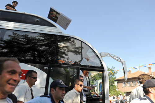 As the bus blew past and a trail of the Turkish equivalent of secret service agents linked arms like schoolchildren around the bus to protect the prime minister, Erdogan continued to throw gifts to his public. One was a rather thick volume of campaign literature, which hit me squarely in the head as I crouched to photograph him, the book mid-air, the bus, and the commando on the bus’s rooftop. As I stood up, a crush of security brushed pass.