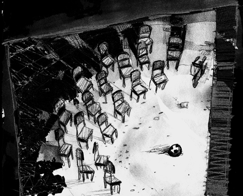 The partygoers had built a dance floor out of wooden boards and painted it black. At one end of the dance floor was a DJ booth and three heavy looking loudspeakers. At the other end were fifty white plastic chairs, which the guests had probably brought from home. The chairs were neatly arranged, waiting to welcome any passerby who might want to join the party. The dance floor was lit up using halogen lights. These were placed on tall stands, giving the appearance that a show was about to take place.