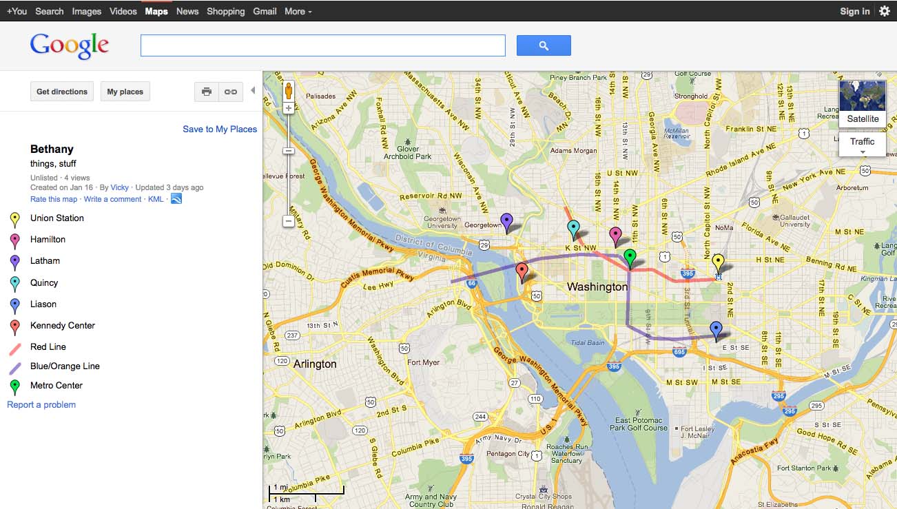 I whipped that up with Google Map Maker in approximately fifteen minutes. Only minimal cartography expertise was required. All I had to do was plug in the addresses and draw in the Metro lines, which took the lion’s share of the time (even lines I can’t draw to save my life). That fifteen minutes of work probably saved my friend an hour of decision-making. Having the location of the hotels, the train station, and the relevant Metro lines all in one place made it simple for her to choose.