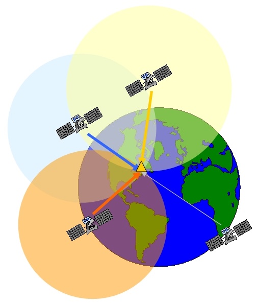 Where does that pinpoint come from? How does the marker more or less know where you are? And why is it sometimes not quite right? GPS, Global Positioning Systems, works by triangulation. For GPS to work properly, your device needs to be able to communicate with three separate satellites. In a car or handheld GPS device, it looks something like this: