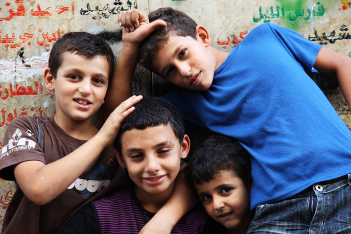 Four boys in Nablus notice our camera, stop their football game, and ask us to take their picture.