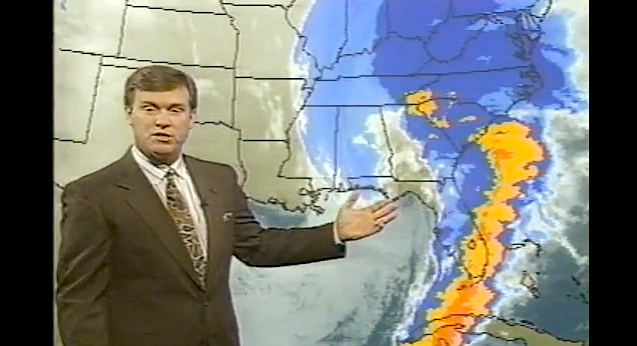 The curious thing about the 1993 Superstorm is that it was one of the first major weather events to be predicted with highly accurate forecast models. It also occurred at a time when most Americans owned VCRs. A quick search on YouTube reveals a wealth of weather-folk in front of large, green-dotted maps, gesturing to the massive comma-shaped storm. These old news clips, taped by home viewers, have been uploaded for anyone to view. Check out this Kentucky local news station’s Superstorm broadcast—the consumer run on video tapes is a nice touch: |