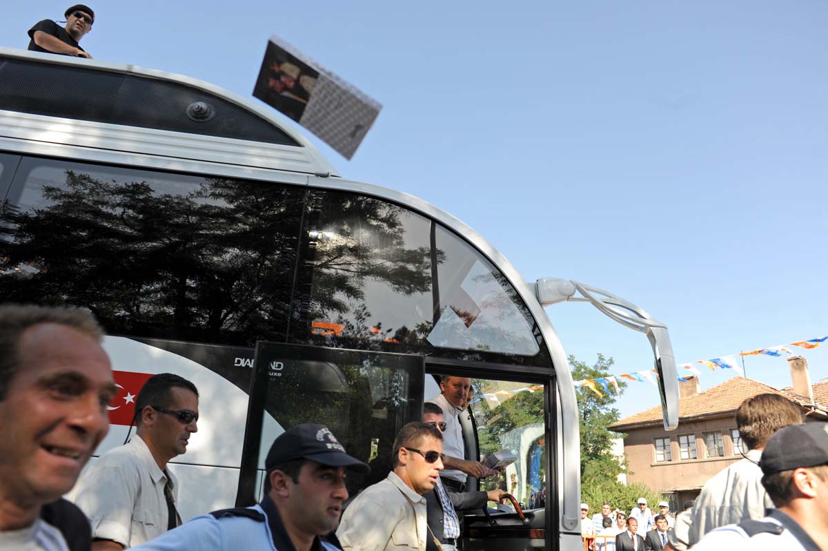 As the bus blew past and a trail of the Turkish equivalent of secret service agents linked arms like schoolchildren around the bus to protect the prime minister, Erdogan continued to throw gifts to his public. One was a rather thick volume of campaign literature, which hit me squarely in the head as I crouched to photograph him, the book mid-air, the bus, and the commando on the bus’s rooftop. As I stood up, a crush of security brushed pass.  |