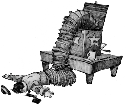 four-thousand pages of prose, it’s still just a fucking cookie. But the jack-in-the-box. Such a quaintly old-fashioned toy. I put the thing in the same mnemonic category as my slinky and my hobby horse. These were concrete, physical toys, designed to be touched, to have the paint rubbed off of them and get all gloopy-edged, worn smooth and shiny with use, with love. I doubt those things would get much of a rise out of a contemporary kid, accustomed to locking gaze into the palliative glow of an electronic screen all day, munching on Cheetos while committing murders and rapes with button-jiggering thumbs. The jack-in-the-box. The box itself is made of tin. This one was good and rusty, its edges jagged with wear, having gotten nice and sharp for baby to cut his grubby little fingers on. The sides of the box are splashed with garish color—red, yellow, blue. Clown colors. The front of the box features a picture of the clown puppet who lies sleeping lightly in a mischievous coil of potential energy under the lid of the box. You turn the crank on the side of the box, and with every click of the sprocket you feel you hear a note of the plinking, stupid song, “Pop! Goes the Weasel.” That’s the tune—but the tempo is up to you. You can turn the crank at a slow, barely rhythmic creep: dink … da—dink … da-diddly … donk …… If you turn it slowly you can feel the distinct plink of every vibration in your fingers, the |