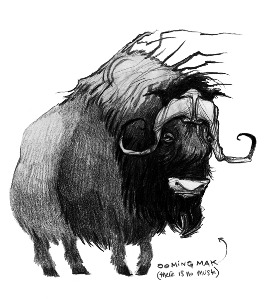 On the other hand, the same term signifies something more vague when one compares a tamed wolf to a feral dog. On the physiological level, when we say that an animal has been "domesticated," it means that its first impression of man does not elicit fear as it would in its wild counterpart. Of course, the fear of man so strongly innate in many wild animals can be stomped out to varying degrees, but will reemerge with every subsequent generation. One fateful day, the first wolf pup was born with floppy ears, forever altering the trajectory of mankind. Musk oxen are still far from that day, as we have only ventured a mere fifty years into an arguably five hundred-year-long process. Musk ox. If your mind conjures up an image of a smelly, black, cow-looking animal with a bullring through its nose—yoked to a plough somewhere north—I don’t blame you. This is what the misnomer musk ox would imply. The term was coined by the first Europeans to stumble across musk oxen, in order to associate their discovery with a commodity; the perfume fixative derived from the musk gland of deer from the Moschiadae family. In the 19th century, such musk (which musk oxen do not have) was a highly-sought good on European markets. |