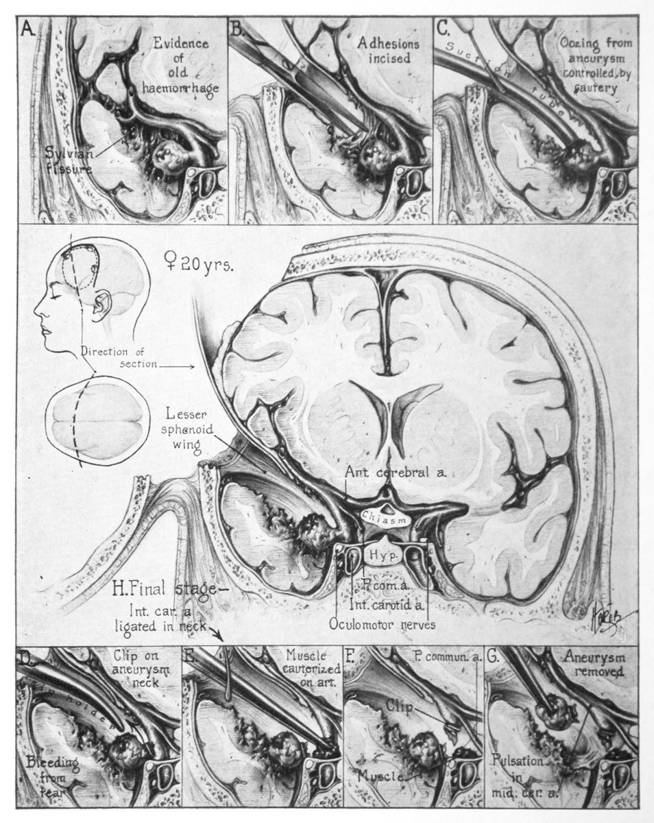 to a copy of Dandy’s book The Brain, an updated and reprinted version of Surgery of the Brain. It is filled with illustrations that demonstrate a thorough understanding of anatomy, a sensitivity with the medium and a deftness of storytelling. Hager Padget’s illustrations produce an almost instantaneous understanding of the procedure, while also allowing dense details to slowly wash over the viewer. As I see it, Hager Padget employs three components that make her pieces exceptionally successful: didactic quality, exquisite rendering and elegant design. All her illustrations contain these elements, but I have chosen three that I think exemplify each talent individually. This first illustration, of the surgical treatment of a ruptured internal carotid artery aneurysm, stands out for its exceptional didactic qualities. |