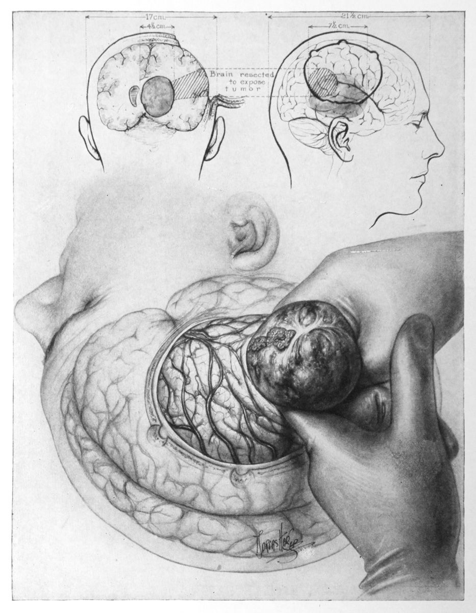 in science and art,” wrote Brödel in his 1926-27 annual report to the Johns Hopkins University President. He went on to state that she qualified to work with Dr. Dandy by studying “with enthusiasm and splendid success.” Walter Dandy hired Hager Padget for full-time work at a salary of $2000 per year (Brödel’s recommendation) which was a moderate sum considering the average wage was $27 a week (approximately $1400 per year).2 Hager Padget could send her little sisters to college. Like many illustrators of that era, she worked mostly in the operating room. Her illustrations from this time expose her genius for rendering technique, design and storytelling. She was evidently learning a tremendous amount about neuropathology and neuroanatomy. Like many illustrators of that era, she worked mostly in the operating room, standing behind Dr. Dandy while he performed surgery. She made many quick sketches and took notes regarding the case then used them to create a refined illustration. Many of these illustrations were used in Dandy’s book Surgery of the Brain. She became one of the leading medical illustrators in the country.3Because of my current position in neurosurgical illustration, I am fortunate enough to have access |
