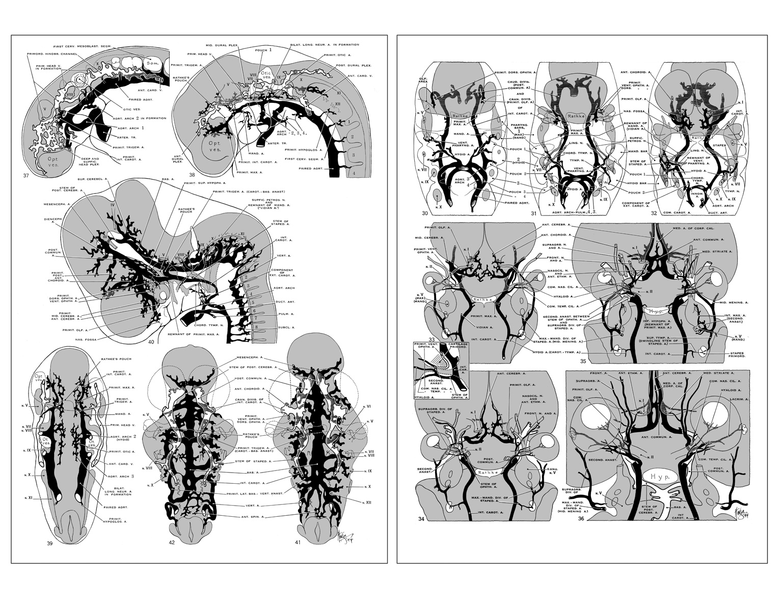 The monograph for arterial development was published in 1948 and was a significant step in the field of neuroembryology. Hager Padget attributed this to the improvements in the development of contrast injection dyes.4 This publication spurred her to move forward in science and with a grant from the Life Insurance Foundation and, aided by her fellowship at the Carnegie Institute, she was able to create and publish a companion piece that described fetal venous development. To me, the incredible thing about these monographs is that for the amount of detail and |