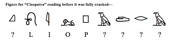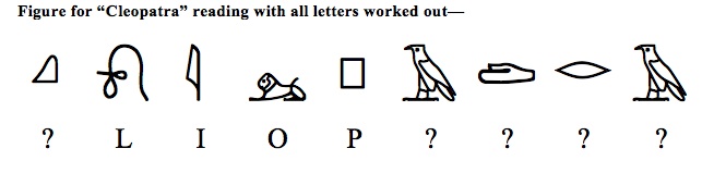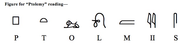 cartouches, this time on an inscribed obelisk believed to have been dedicated by Ptolemy and wife Cleopatra. Sure enough, the proposed ptolmiis spelling appeared again. Applying the same sign values to the other cartouche produced ?-l-i-o-p-?-?-?-?, where the the sixth and ninth signs were the same. The implication was that the first sign had to be k, the seventh sign a different character t, the eighth r, and the identical sixth and ninth signs a , for Klêopatra. Champollion went on to check these proposals against other names recorded in other inscriptions—other members of the Ptolemaic dynasty and various Roman emperors—each time confirming his readings and adding new phonetic characters to the list. At this point, Champollion had shown how Egyptian scribes dealt with names. It remained to be determined how the rest of the script worked, and at first Champollion assumed that the ideographic model was correct. Before long, though, he realized that the same characters that were used to spell personal names were also by far the most common signs in the script—not just in Roman times, but throughout its whole history. Treated phonetically, they yielded sensible, grammatical readings in a language recognizable as ancestral to Coptic. |