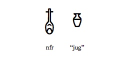 (5) This spelling gives us the word for “wine” or “beer.” Just like “clothing,” this word uses the consonantal root nfr. Since Egyptian doesn’t normally record vowels, there would be no way to tell whether the scribe meant “clothing” or “beer” if he had just written the consonantal root. The second sign, depicting a jug, resolves the ambiguity by telling us that the right word means a kind of liquid.