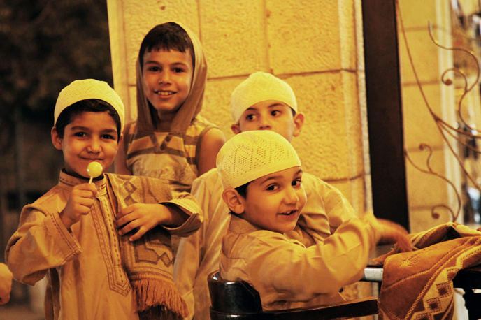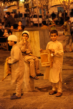 Young boys lay out their prayer mats in anticipation of evening prayers in an Old City square, Bethlehem.