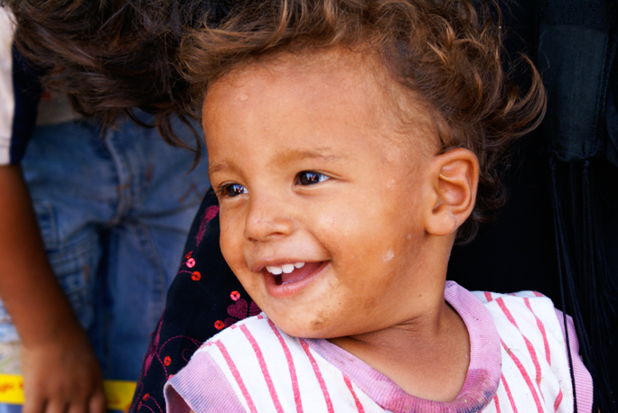 A young member of a Bedouin herding community outside Jericho is excited by our camera.