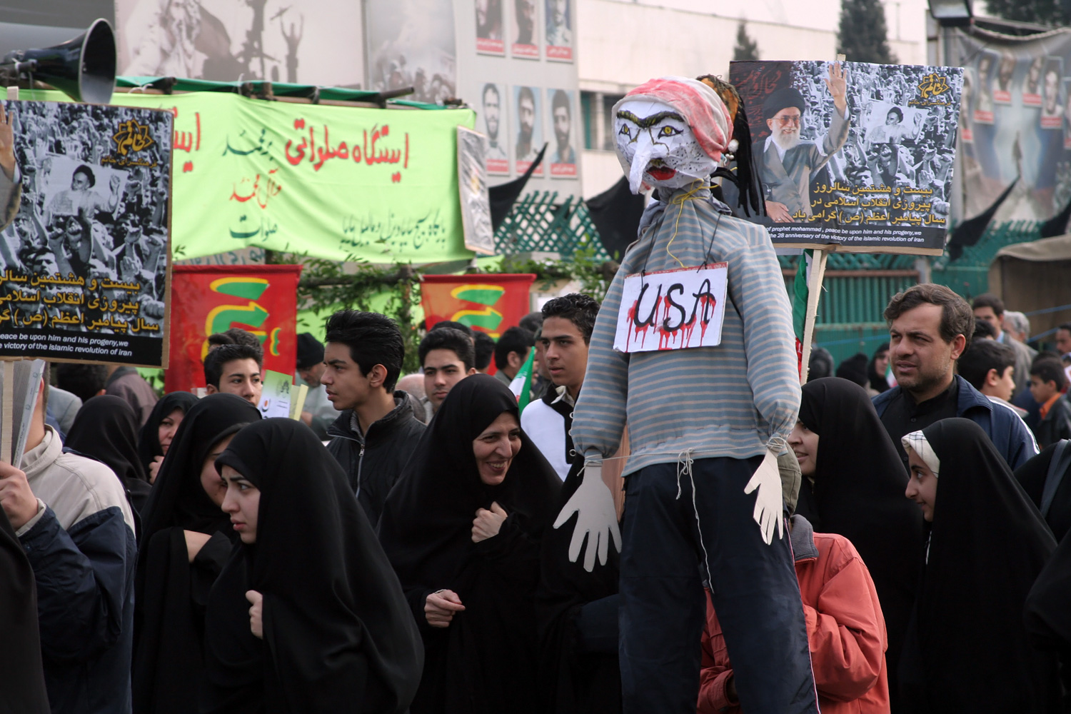 deceiving themselves. In Iran, one small but significant portion of the population suffocates the rest. We have to look inside for the causes and remedies. Palestine’s predicament is completely different. It suffers largely at the hands of outside forces, and as a result of outside interference. Their plight deserves everyone’s full and immediate attention. In Iran, we make our own chains. ![]() ![]() A pro-government demonstrator hands out posters. The poster reads 'Death to America'. |